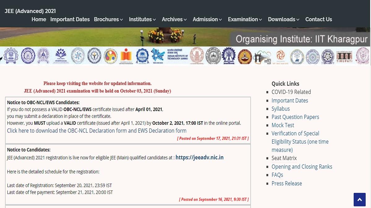 The Indian Institute of Technology IIT Kharagpur will be issuing the admit card for Joint Entrance Examination JEE Advanced 2021 on the official website wwwjeeadvacin. The admission pass will be available for download until October 3 the day of the JEE Advanced 2021 exam. JEE Advanced Admit Card 2021.